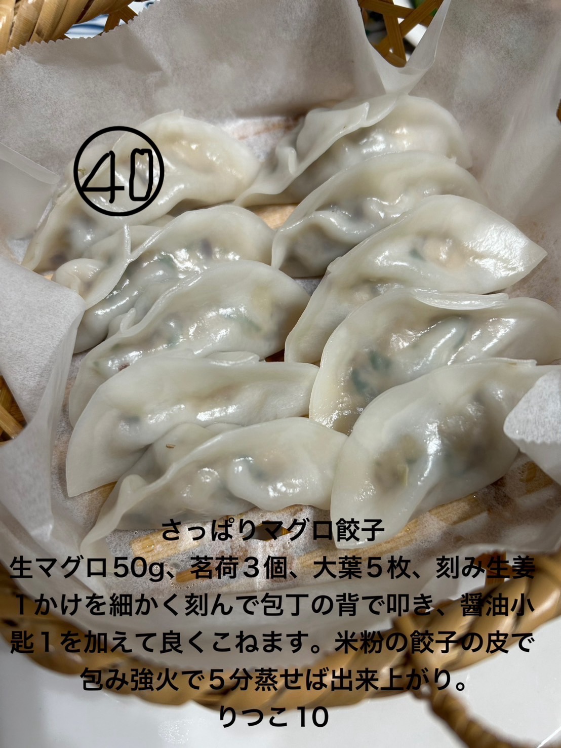 さっぱりマグロ餃子 醤油小さじ1、ごま油小さじ1を加えて良くこねます。米粉の餃子の皮で包み、お湯が沸騰してから強火で5分蒸します。