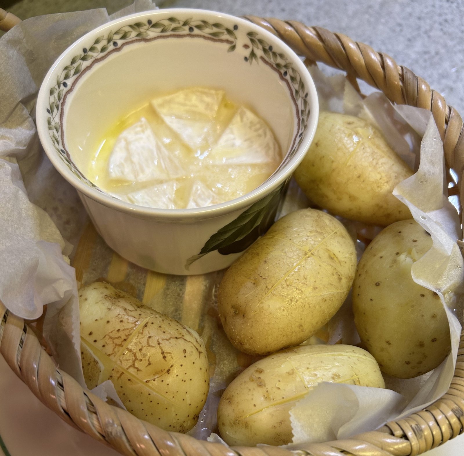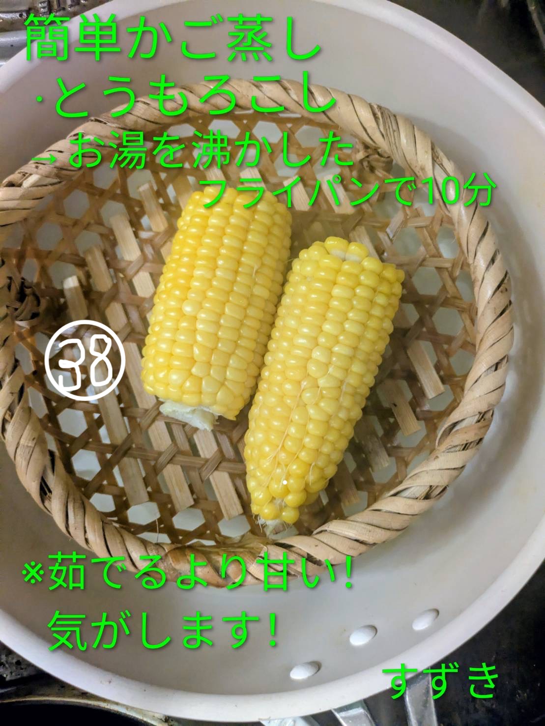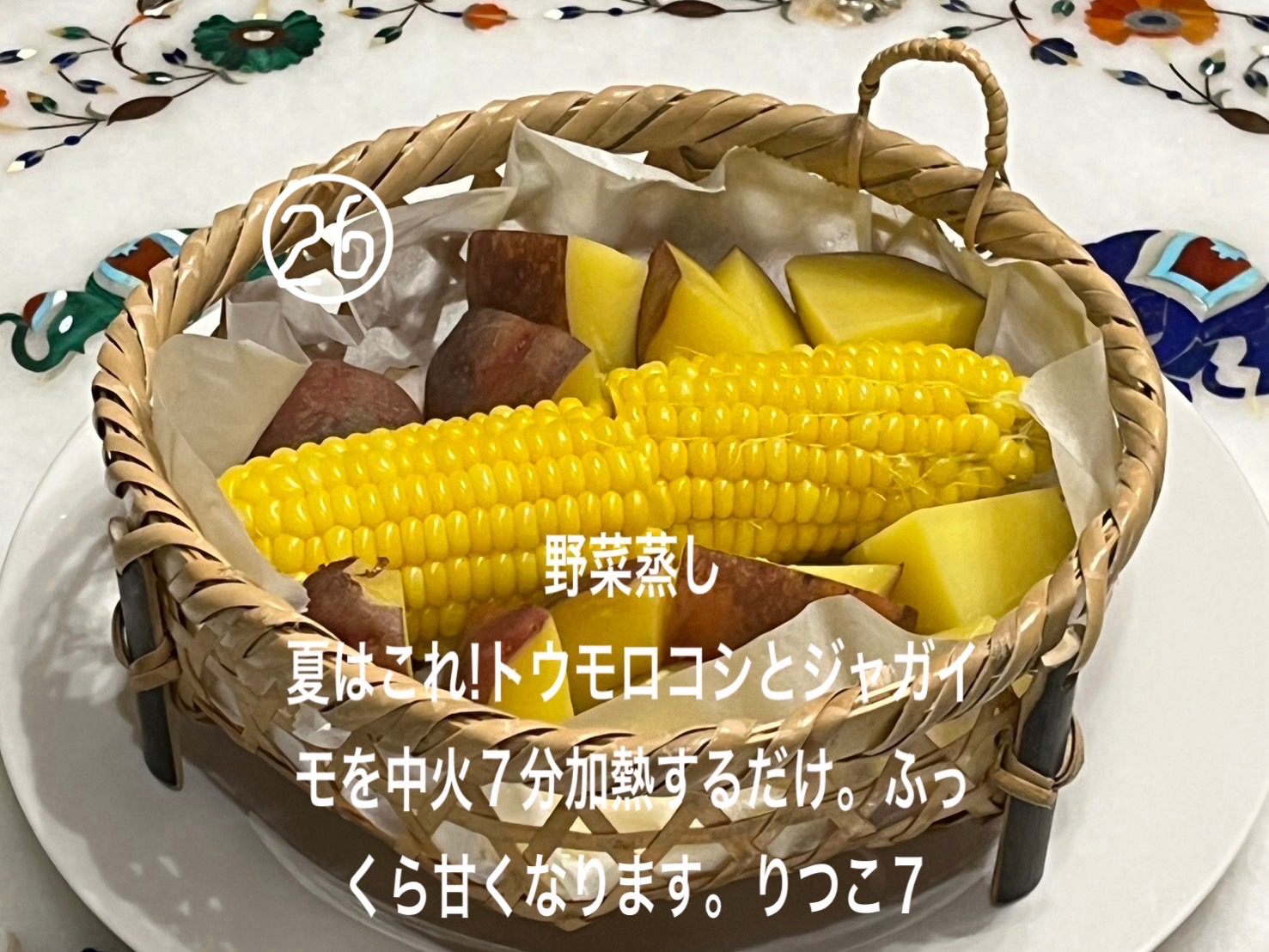 コーンと新じゃがの蒸し物 ジャガイモはたわしで泥を落として4つ割りにすると早く火が通ります。茹でるよりホクホクです。