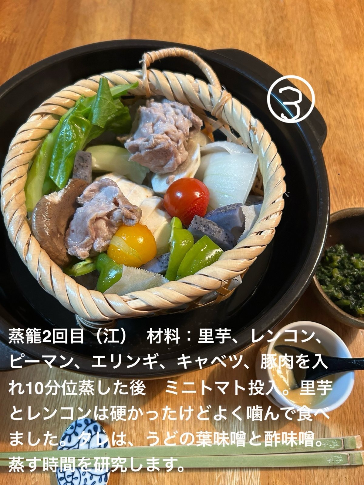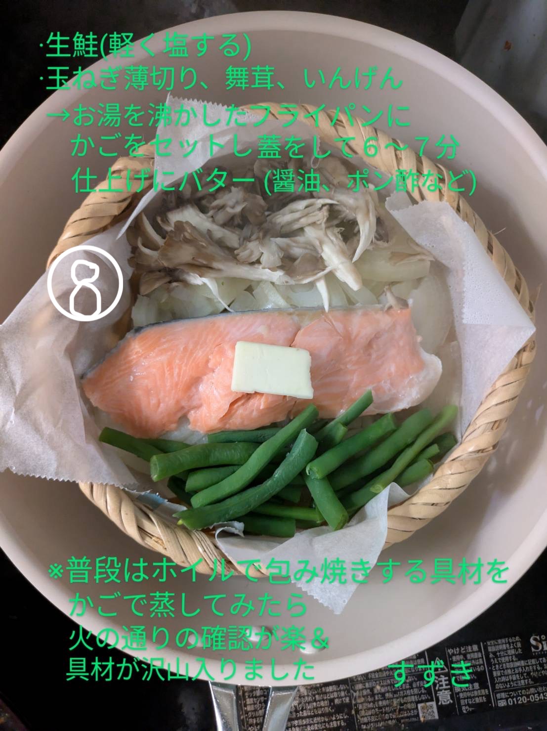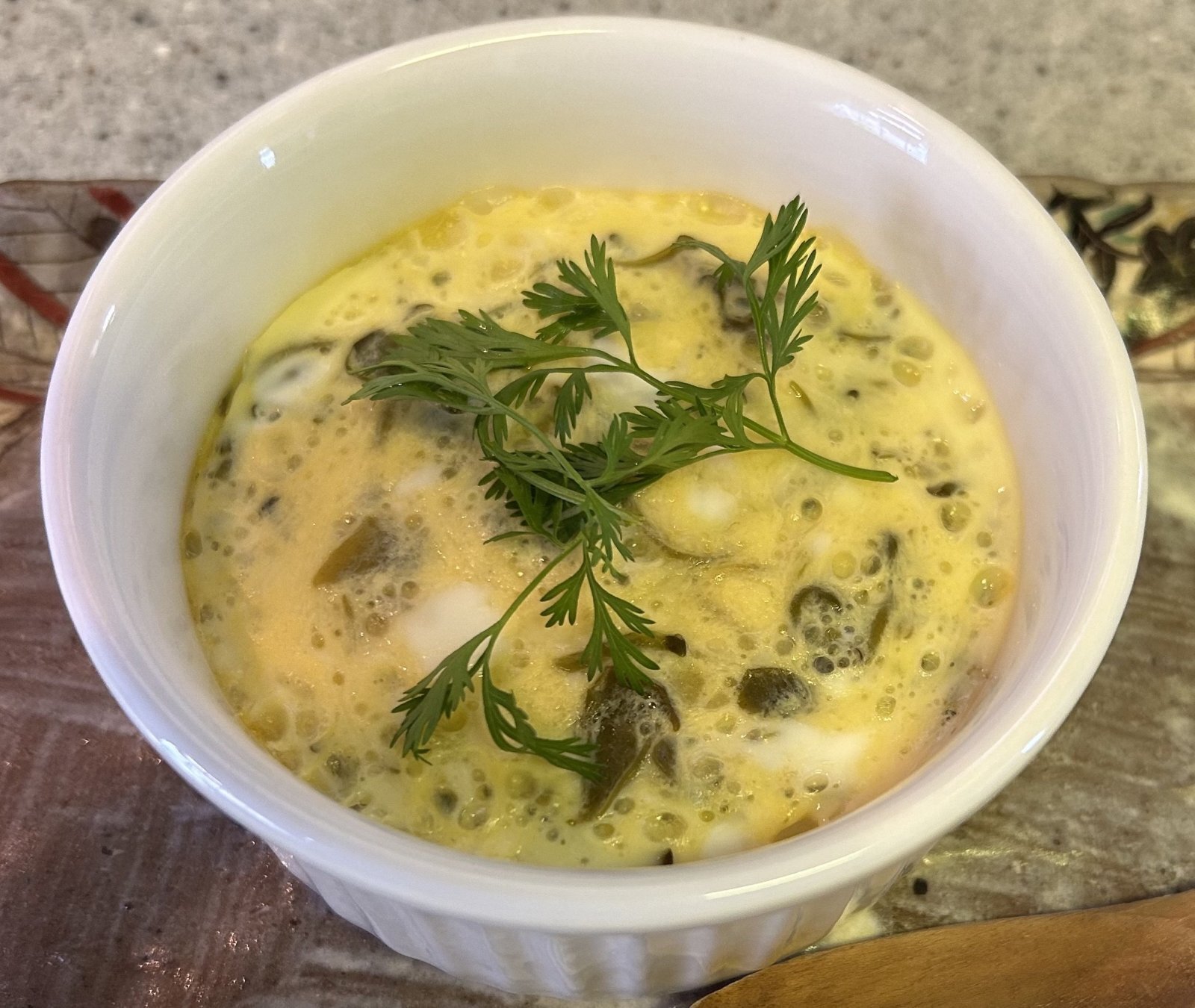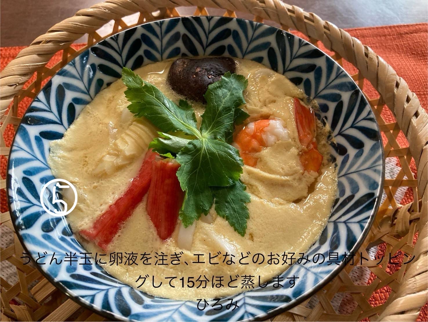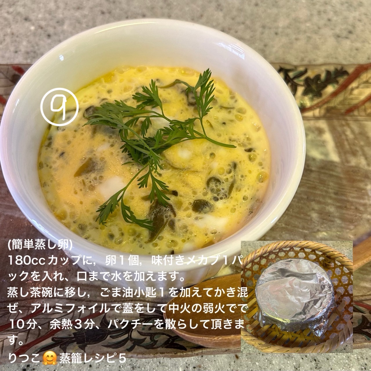 簡単蒸し卵 余熱3分、パクチーなどの青葉を散らして頂きます。 47