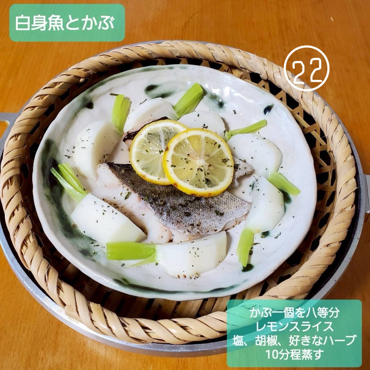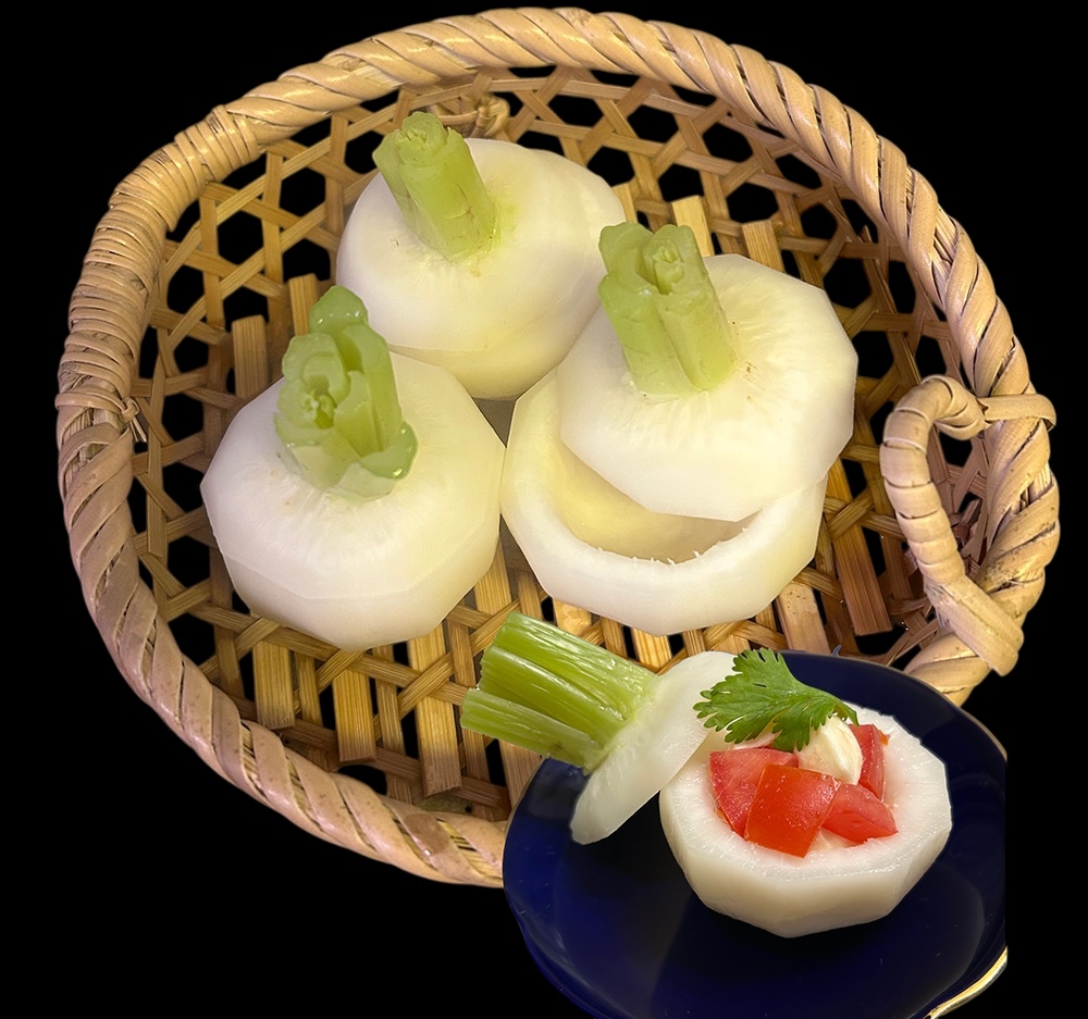 カカップ カブの皮を剥き、上部を切り離し、スプーンで中を掘ります。切り取った上部を載せて弱火の中火で4分蒸します。